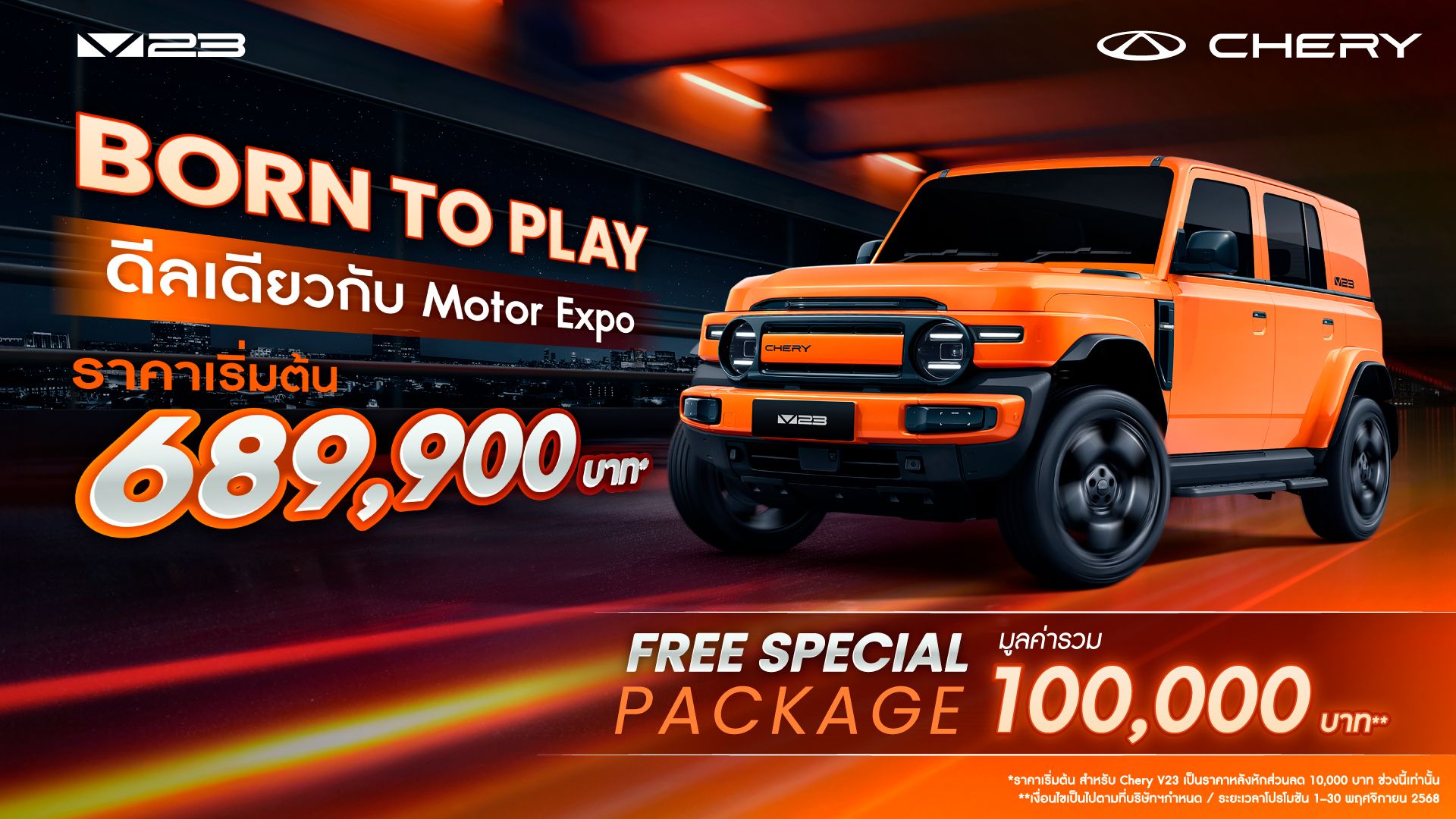o Chery V23: เอสยูวีพลังงานไฟฟ้า 100% โดดเด่นด้วยดีไซน์ทรงกล่องสไตล์เรโทร (Boxy Design) ยานยนต์ที่ออกแบบมาให้ขับสนุก “Born To Play” ในสไตล์ของคุณเอง เพราะทุกเส้นทางคือแรงบันดาลใจ